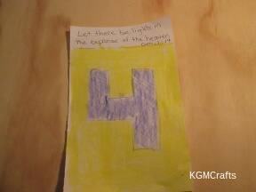 Draw a number one on the first piece of paper. Make the number one 1 inch wide. Color the number black. With a yellow crayon, make lines around the one to look like sparks of light. Write, “Let there be light. Gen. 1:3”